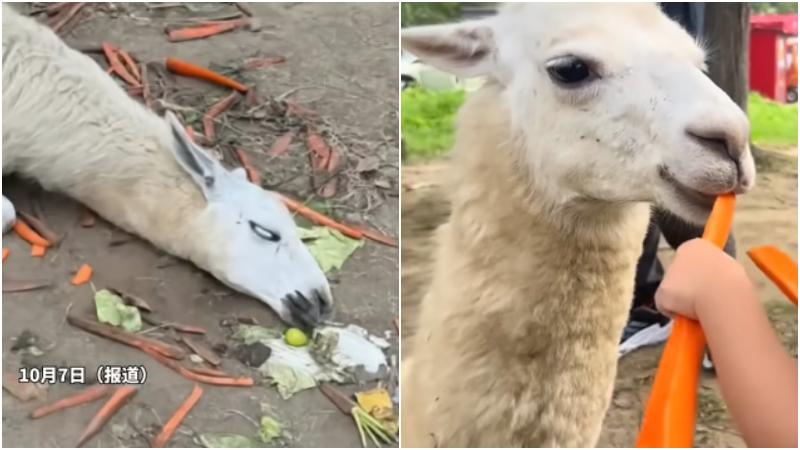 綜合內媒報道,根據現場照片顯示,至少兩隻羊駝躺倒在地、眼神呆滯,四周散落著大量胡蘿蔔、白菜等餵食殘渣,令人擔憂。網友憂心表示:「牠們真的吃不下了。」也有網友曬圖指出,「帶了5斤(約2.5公斤)胡蘿蔔,餵了4斤(約2公斤)。」但也有人擔憂:「眼睛都翻白了,這不像正常狀態。」