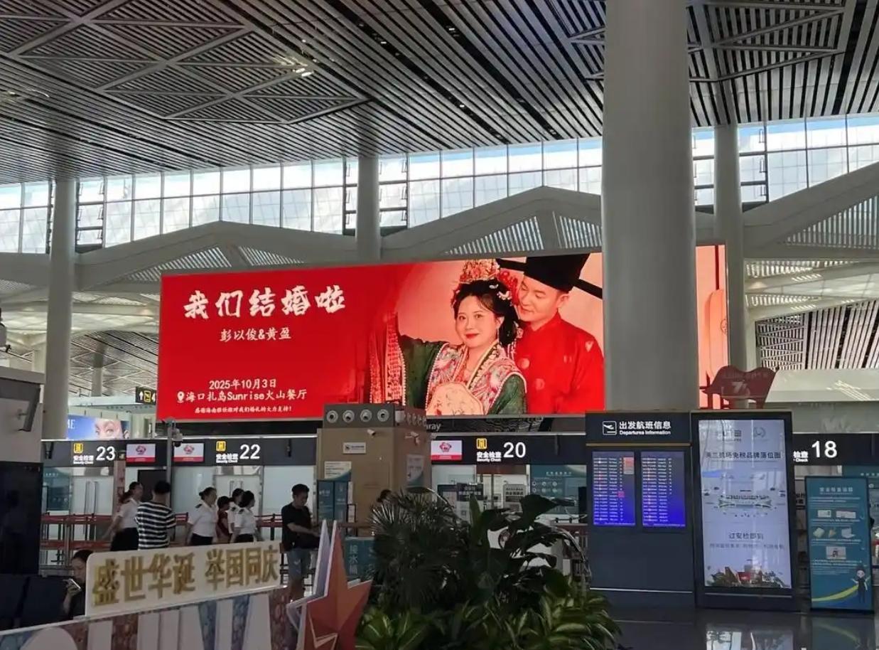 「十一國慶」期間,海南海口美蘭機場被特別的廣告「洗版」,一對新人的婚禮邀請函在機場88塊螢幕上同步播放,從登機口的直立螢幕到機場大螢幕,連續播放8天,引發網友熱烈討論。新娘黃女士表示,這是希望把幸福分享給所有旅客的浪漫舉動。