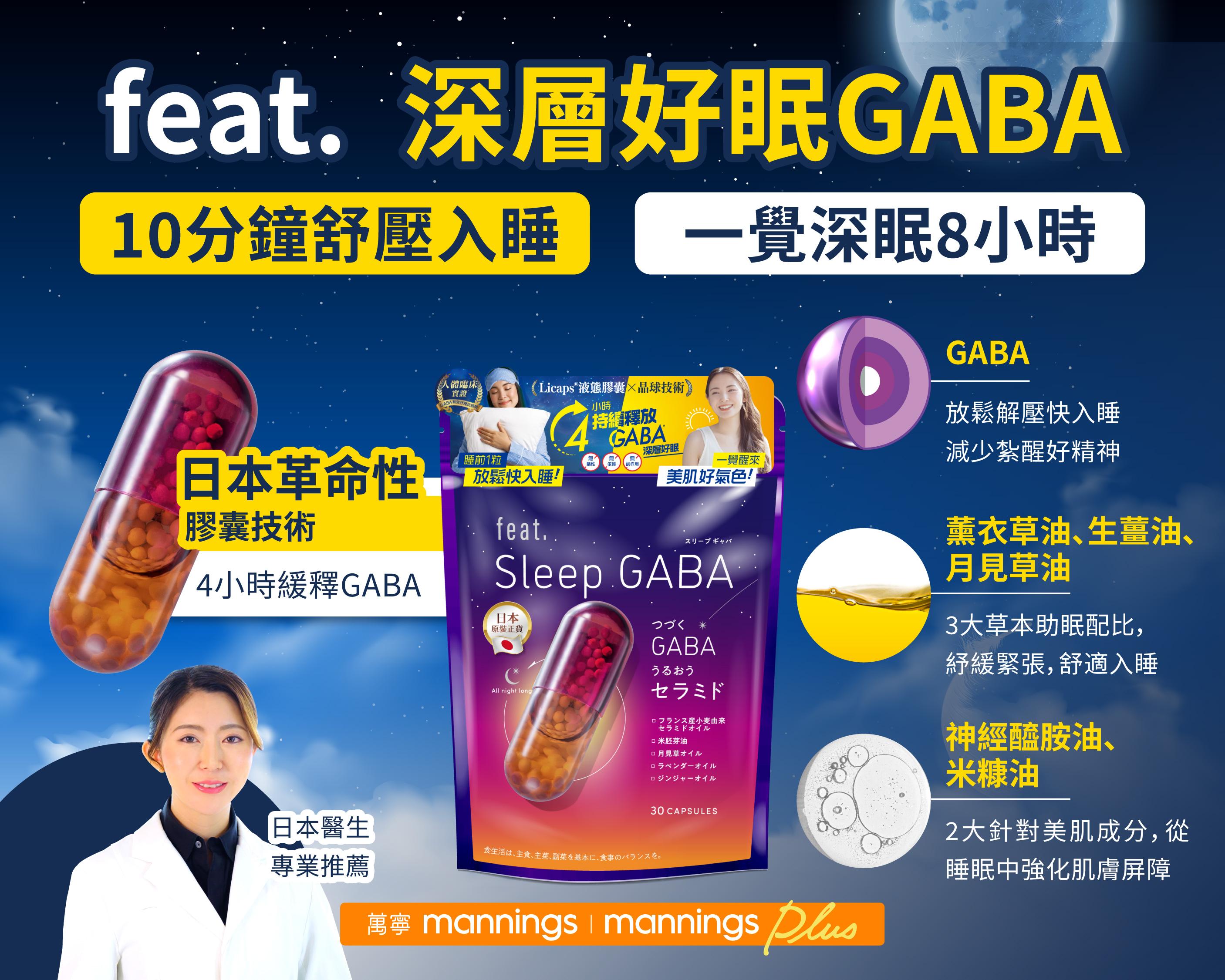 由日本團隊研發的「feat. 深層好眠GABA」,嚴選GABA成分,睡前30分鐘服用一粒,臨床證實有效紓壓抗焦慮,10分鐘快速入睡。更採用革命性Licaps®液態膠囊 x 晶球技術,其中特製的GABA 晶球有效於睡夢中持續緩釋4小時,減少在睡覺途中醒來的次數,延長深層睡眠時間,提升睡眠質量,令你一覺睡天光,睡醒更精神飽滿。