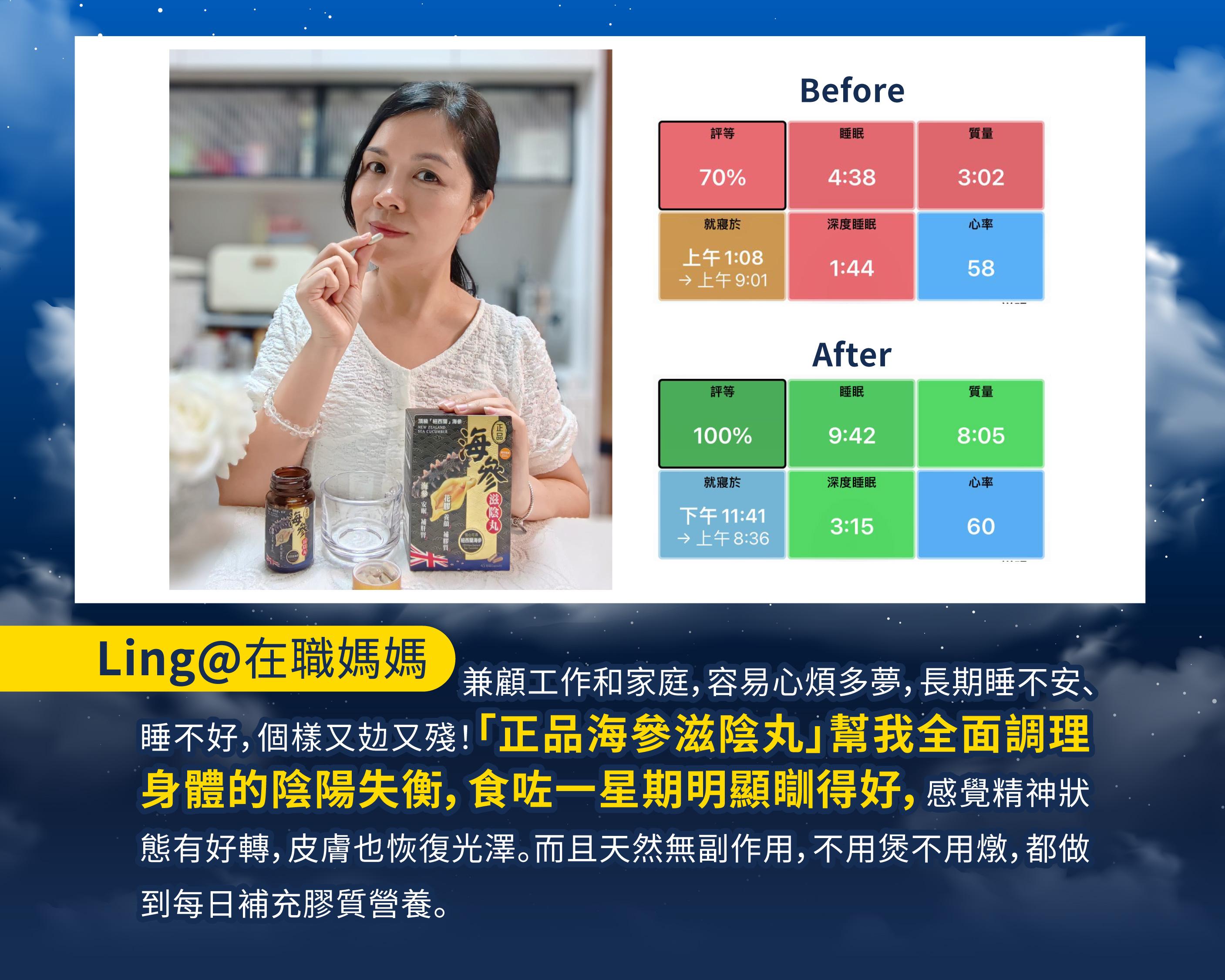 「兼顧工作和家庭,容易心煩多夢,長期睡不安、睡不好,個樣又攰又殘!『正品海參滋陰丸』幫我全面調理身體的陰陽失衡,食咗一星期明顯瞓得好,感覺精神狀態有好轉,皮膚也恢復光澤。而且天然無副作用,不用煲不用燉,都做到每日補充膠質營養。」