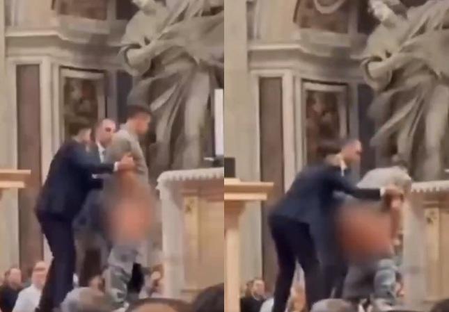 男子在梵蒂岡聖伯多祿大教堂聖壇旁邊突然脫褲小便,保安員上前阻止。(互聯網)