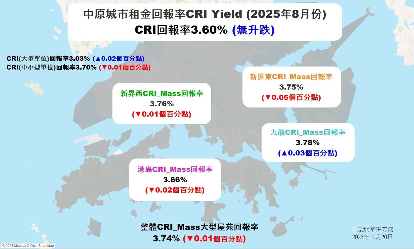 2025年8月份CRI_Mass回報率報3.74%,按月跌0.01個百分點。CRI(中小型單位)回報率報3.70%,按月跌0.01個百分點,結束3個月連升。CRI(大型單位)回報率報3.03%,按月升0.02個百分點,連升4個月共0.16個百分點。CRI_Mass及中小型單位回報率分別為2011年11月後及2011年10月後逾13年半次高。大型單位回報率則創2010年6月後逾15年新高。