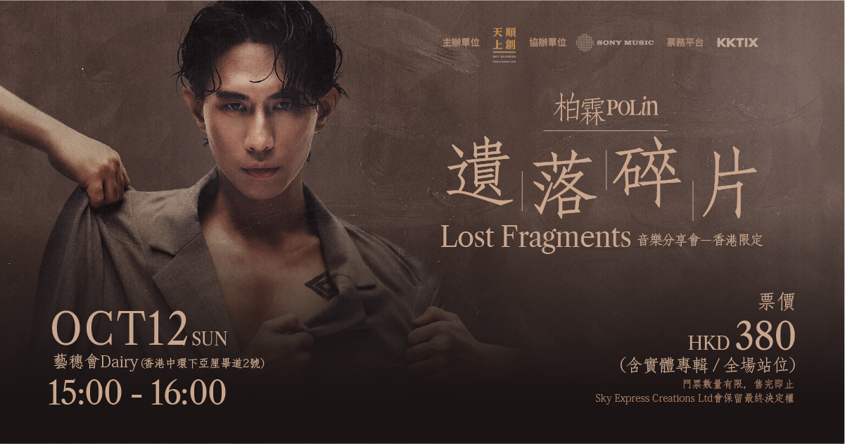 華語男歌手柏霖PoLin憑全新創作專輯《允許萬物破碎》入圍「第36屆金曲獎最佳華語男歌手」,他將於10月12日下午3時在中環藝穗會Dairy舉行《遺落碎片Lost Fragments音樂分享會 - 香港限定》,這也是他首次來港跟歌迷零距離見面。屆時柏霖PoLin在這場限定分享會中透過每一首歌的創作故事和演唱動機,用歌與真實心聲帶你走進每一首作品的誕生片刻,認識他作為音樂人的靈魂與選擇。今次音樂分享會為全場站位, 特別福利為分享會後柏霖PoLin親手送上簽名海報活動,票價一律為$380 (含實體專輯),門票於KKTIX公開發售。