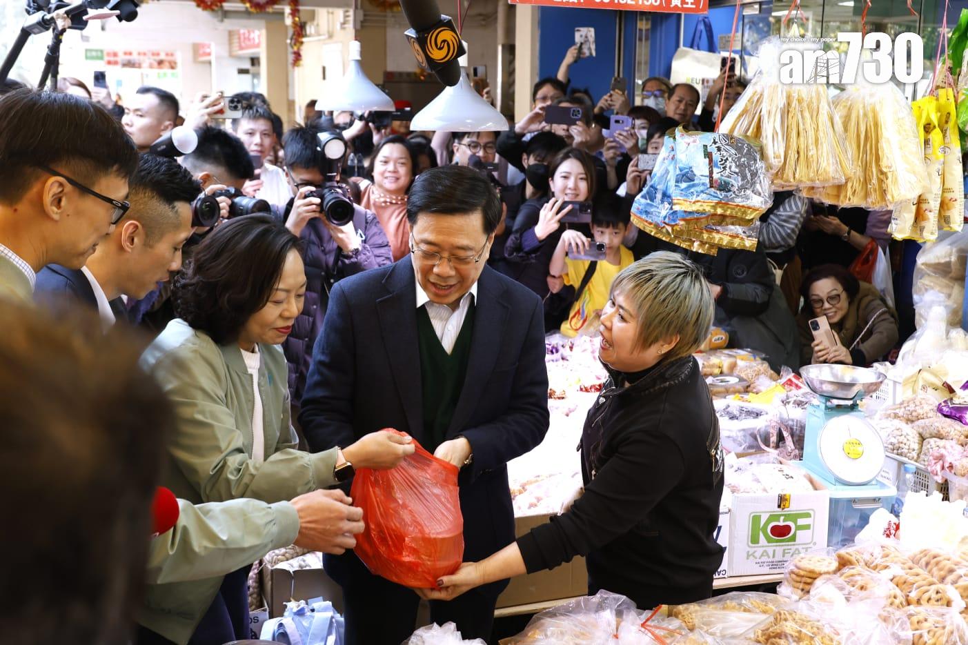 農曆新年將至,行政長官李家超今日下午到何文田愛民邨探訪住戶,並了解邨內商戶的經營情況,買了兩底蘿蔔糕,形容好事成雙。