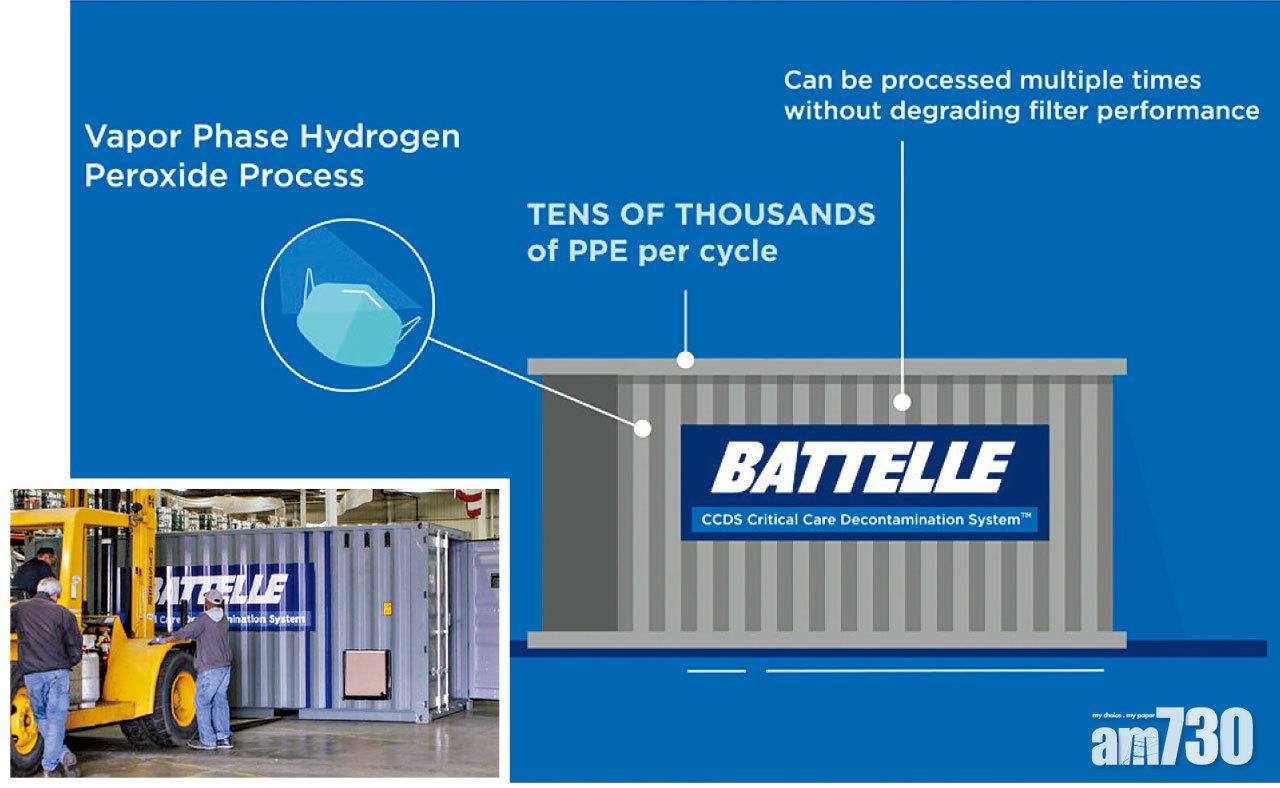 Battelle將貨櫃改裝成大型消毒器,可一次過將上萬個用過的N95放入貨櫃內,並透過「氣態過氧化氫」(Vapor phase hydrogen peroxide、即氣態雙氧水)技術,將新冠病毒在內的生物污染物清除,過程中不會產生水分,得以令口罩結構不受破壞,令其可重用。整個「消毒程序」約需2.5小時,之後口罩便能運回所屬醫療機構,而口罩可消毒重用達20次,且不影響過濾性能。FDA本來把上述機器的消毒N95上限定在每日1萬個,惹來俄州州長德維恩(Mike DeWine)不滿,總統特朗普亦在Twitter開腔,最終FDA迅速撤銷限制。美政府與民間早在2015年研究有關技術,Battelle目前有2個消毒櫃,另有2個正在紐約州長島安裝、一個即將送抵紐約市,故短期內最少有5個消毒櫃可運作,每日合共消毒40萬個N95,稍後還會向西雅圖及首都華盛頓運送消毒櫃。