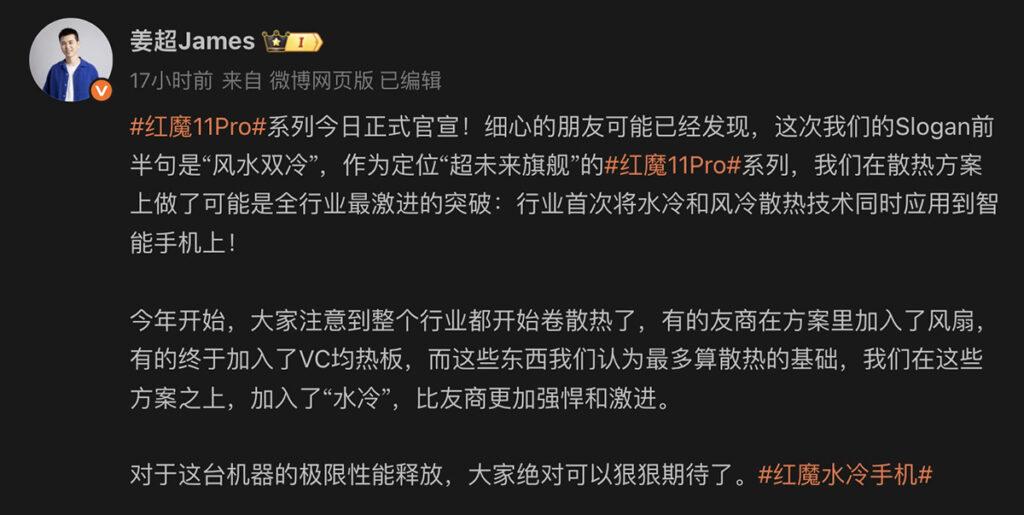 紅魔遊戲手機產品總經理姜超提到,紅魔11 Pro將為首部同時採用風冷跟水冷散熱的智能手機,務求能發揮新代旗艦晶片組極限效能。