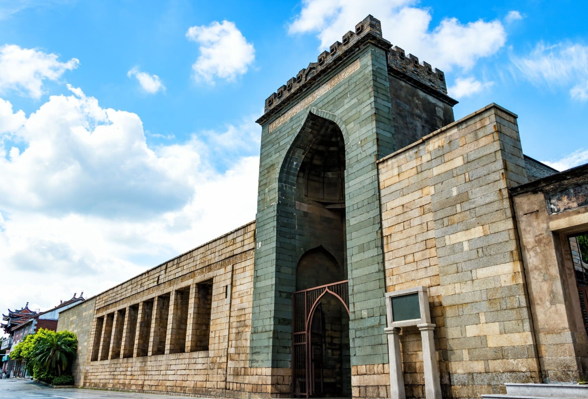 泉州清淨寺的尖拱門上以阿拉伯文雕刻了《古蘭經》的內容。(圖片來源:Shutterstock) 泉州清淨寺現存的主要建築包括門樓、奉天壇及明善堂。圖示的門樓屋頂為「望月台」,是神職人員觀月、決定封齋與開齋日期的地方。(圖片來源:Shutterstock) 泉州清淨寺東側的新禮拜堂是2009年才啟用的現代建築,由阿曼蘇丹王出資50萬美元興建,作為贈予清淨寺建寺1,000周年的賀禮。(圖片來源:視覺中國)