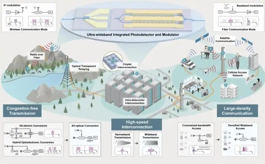 論文通訊作者、北京大學電子學院副院長王興軍表示,新系統破解「帶寬鴻溝」,數據傳輸速率刷新目前已知的新紀錄。這一系統可支持光纖通訊和無線通訊雙模式傳輸,顯著提升抗干擾能力。