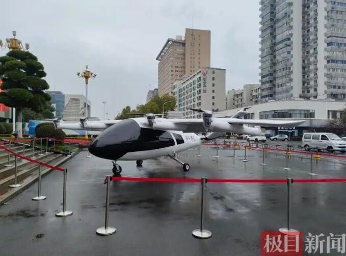 武漢迅起科技展示的V1000型傾轉旋翼混動eVTOL翼展達13.26公尺,最大起飛重量2.8噸。該公司飛行器項目副總師李佳介紹,V1000A載人版可搭載4人,V1000B貨運版載重400公斤,續航里數超過1000公里,足以從武漢飛往廣州、南京、上海等地,能覆蓋全國90%的大中城市。