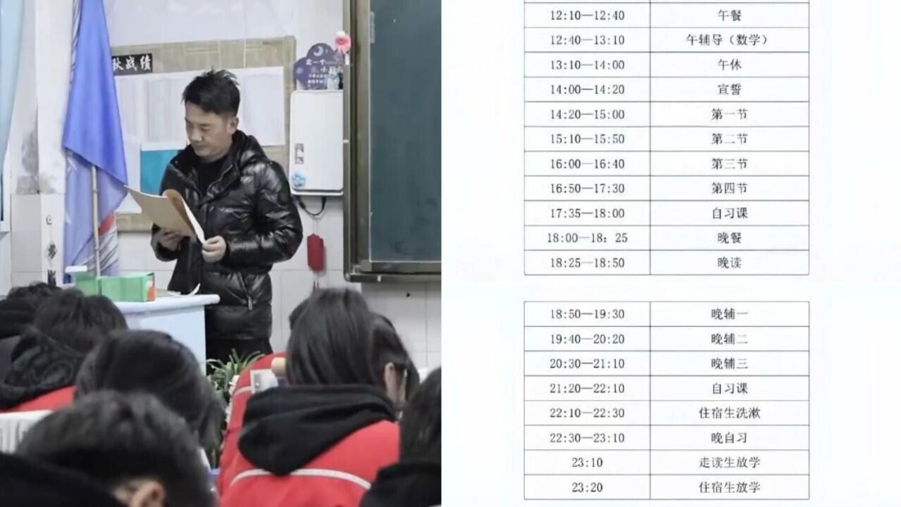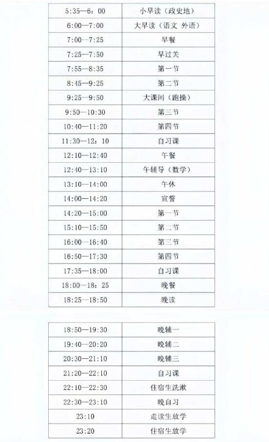 網傳作息時間表顯示,學生每天的日程幾乎被學習填滿。早晨5點35分開始小早讀政史地,7時早餐有25分鐘,午餐和晚餐分別為30分鐘與25分鐘,午休安排50分鐘,甚至還有20分鐘的宣誓時間。晚上10點後,住校生需在20分鐘內完成洗漱,隨後繼續晚自習至23點20分,而走讀生(非住校生)則需上課至23點10分才放學。