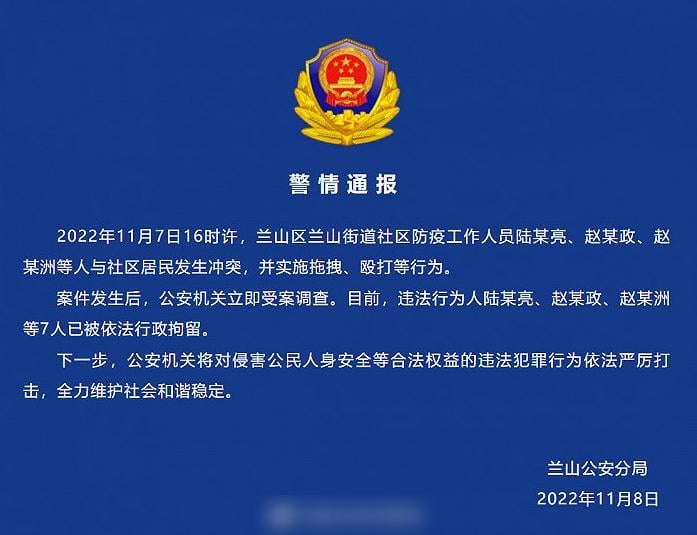 山東臨沂蘭山區警方今日通報,蘭山街道7名防疫人員昨午4時許與居民發生衝突,並發生拖拽、毆打等行為,涉案7人已被行政拘留。蘭山區警方強調,將對侵害公民人身安全等合法權益的違法犯罪行為依法嚴厲打擊,全力維護社會和諧穩定。