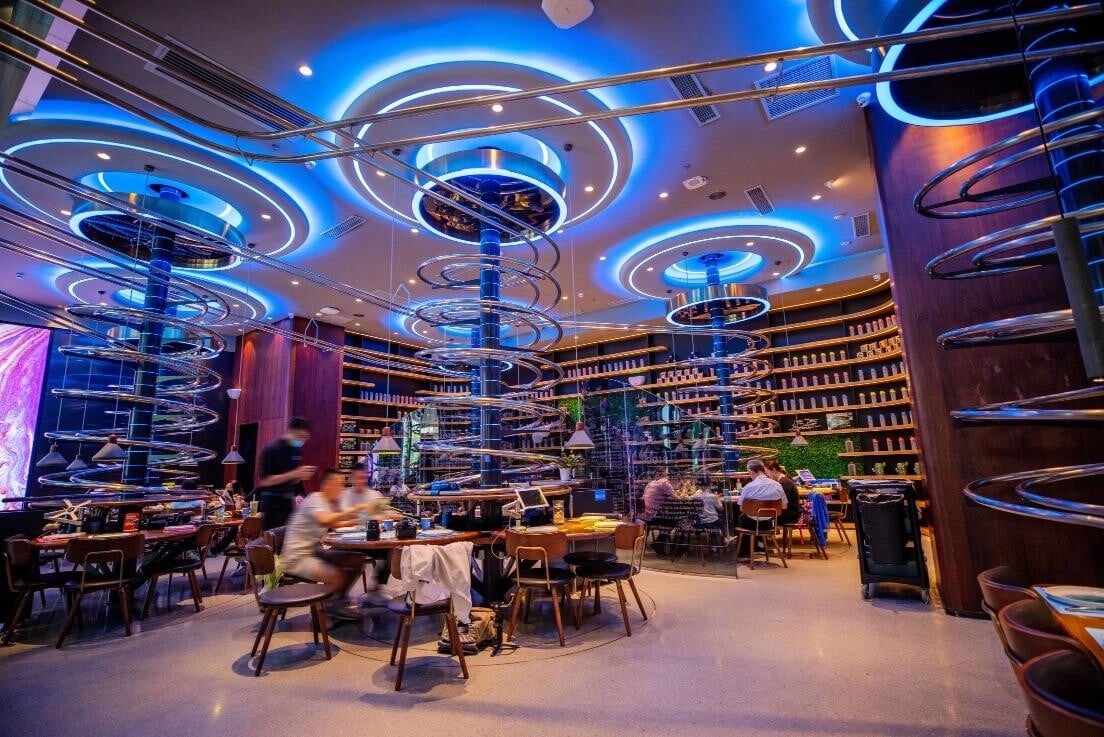 餐廳內一條軌道連着三張圓桌,所以一條軌道可以照顧三桌食客。整個失重餐廳充滿密密麻麻的鋼鐵質感,科幻深藍色的燈光打在銀色的軌道,整個餐廳的空間就如同科幻電影裏面的未來餐廳一樣。