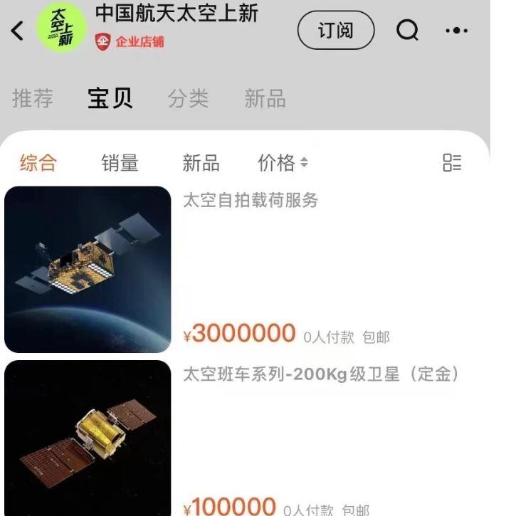 《騰訊網》上有網友表示,淘寶上一間名為「中國航空天文上新」的店家販賣了各式各樣新奇的天文物品,包含要價300萬元人民幣的太空自拍載荷服務,以及一款售價10萬元人民幣名為「太空班車系列-200KG級衛星」的商品,下方標註竟還寫着「包郵」二字,不過實際要怎麼配送,又會送來甚麼東西,目前都不得而知,兩樣商品至今仍是0人付款的狀態。網友後續查詢發現,該家淘寶店鋪背後的運營公司是成立於2016年的「北京太空上新文化傳播有限公司」,主要做零售業、廣告設計、代理等業務,至於商用衛星本體,據了解是由「九天微星工廠」合作製造。