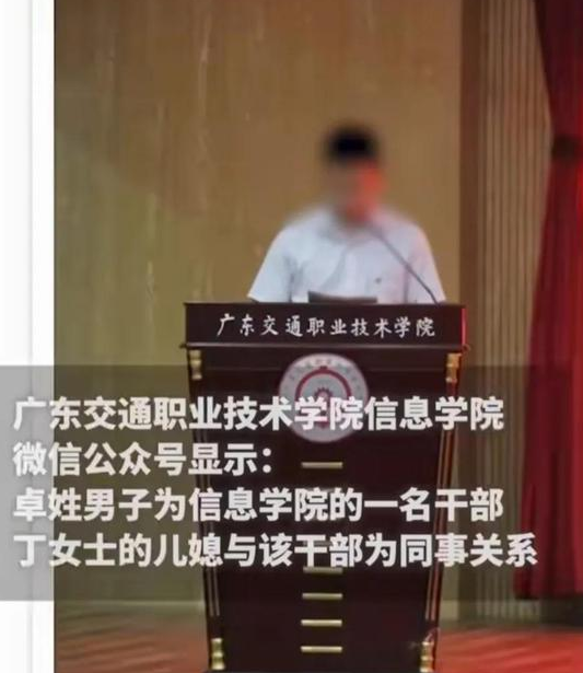 內媒《九派新聞》報道,廣東交通職業技術學院信息學院微信公眾號顯示,卓男為信息學院的一名幹部,至於偷情的女方與他為同事關係。氣憤的女方丈夫與婆婆丁女士不僅報了警,還向學校實名舉報了二人姦情。