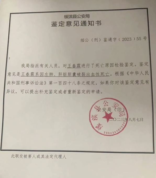 公安局的鑒定意見通知書顯示,王春霖因左肺、肝膽膽囊破裂出血性死亡。(圖/翻攝微博@大皖新聞)