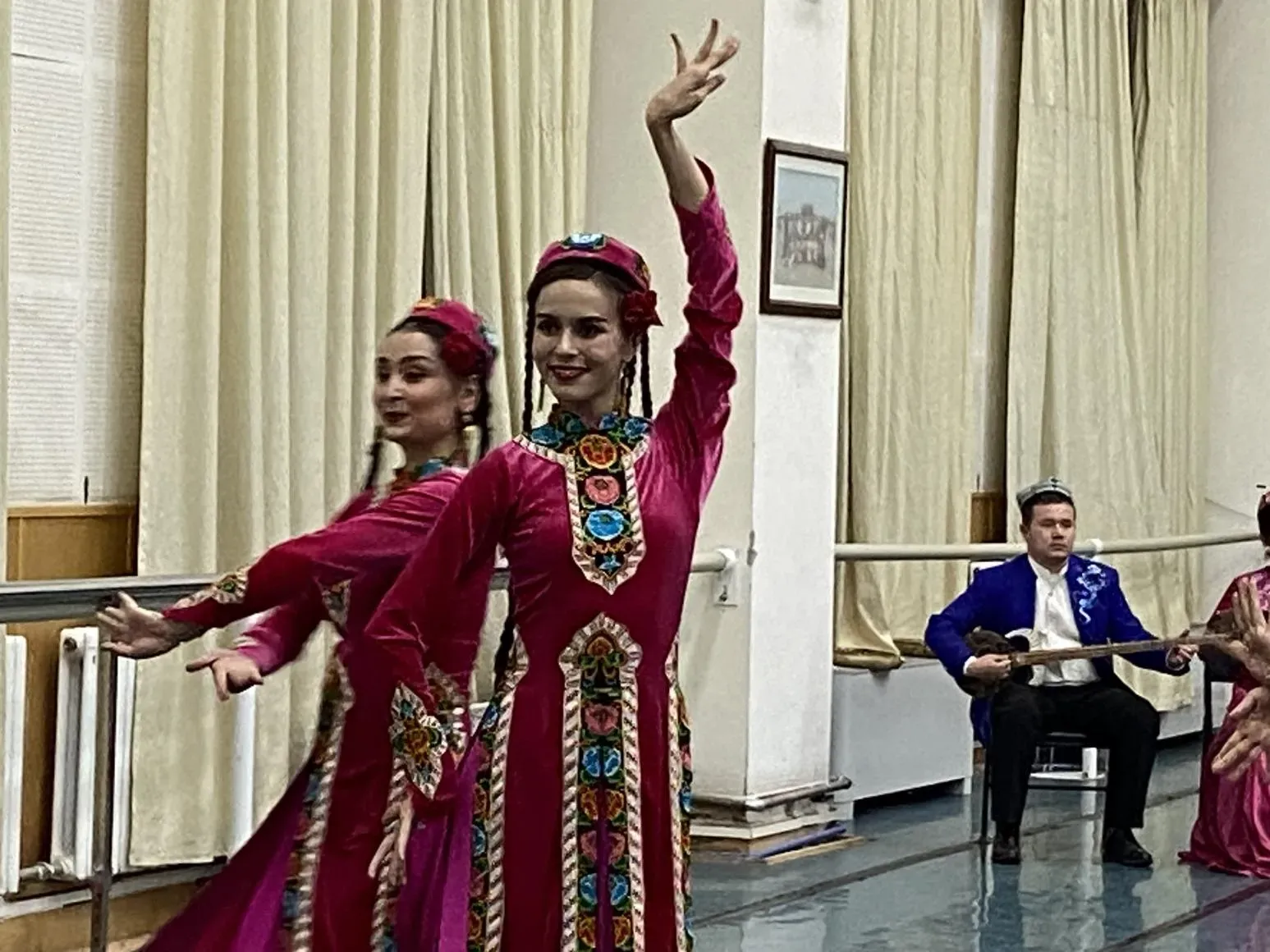 伴隨薩塔爾、艾捷克、獨它爾、彈撥爾、揚琴、手鼓奏響的十二木卡姆樂曲,美麗的維族姑娘緩緩登場,在練舞室內翩翩起舞,或搖肩動頸、或閃轉騰挪,歡快節奏搭配整齊劃一動作,表演細膩優美、韻味十足,將新疆十二木卡姆的藝術魅力表現得淋漓盡致,令人叫絕。