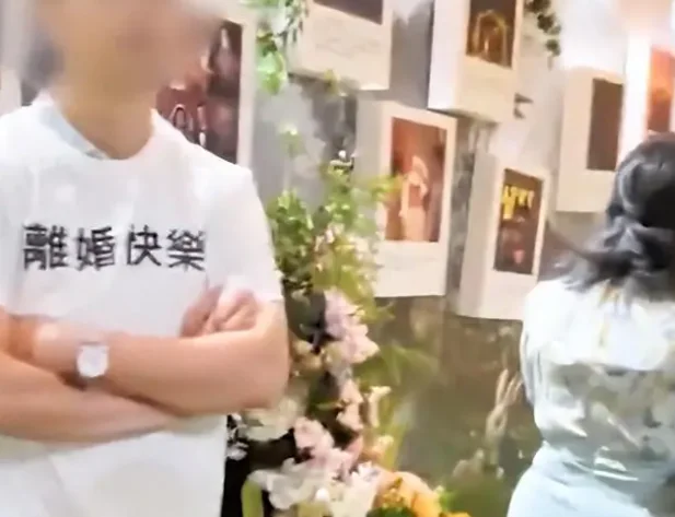 大陸福建廈門一對新人近日舉行了婚禮,沒想到在舉辦過程中,突然有男子身穿印有「離婚快樂」四個大字的T-shirt,出現在會場大鬧,打破原本歡樂的氣氛,讓來參加的賓客看傻了眼。只見男子闖進婚禮現場後,嘴裡不斷叫嚷,情緒看起來相當激動,最後甚至還撂下狠話稱「給他機會了,那是我的狗,你弄我我以後弄死他,我知道他在哪裡」,在旁的伴郎與接待人員看到,趕緊上前阻止男子靠近新人,原本歡樂的場合,瞬間變成一觸即發的戰場。