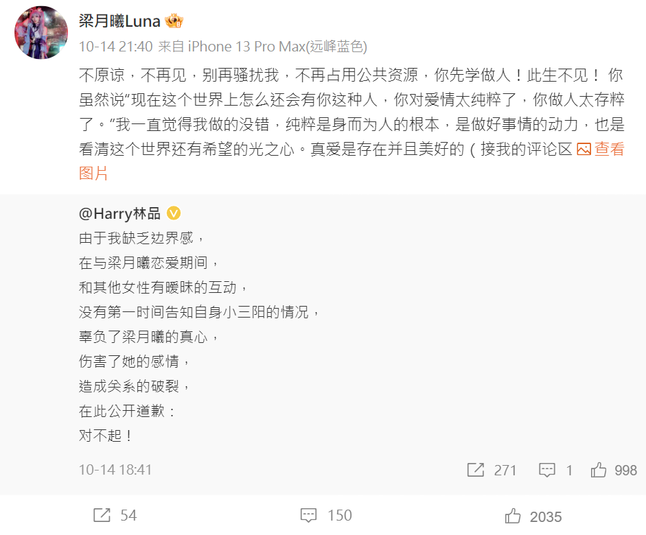 林品2006年考入北京大學中文系,2010年獲文學學士學位,2013年獲文學碩士學位,2017年獲文學博士學位,因為常常cos哈利波特在網路上累積知名度,也因參加答題節目《一站到底》,而為觀眾所知,其劈腿消息曝光後,馬上在網路上引起軒然大波。14日晚間,林品在微博發文表示「由於我缺乏邊界感,在與梁月曦戀愛期間,和其他女性有曖昧的互動,沒有第一時間告知自身小三陽的情況,辜負了梁月曦的真心,傷害了她的感情,造成關係的破裂,在此公開道歉:對不起!」,承認了女方指控屬實。不過兩人似乎已經徹底撕破臉,針對林品的道歉,梁月曦毫不領情,直接表態「不原諒,不再見,別再騷擾我,不再佔用公共資源,你先學做人! 此生不見!」
