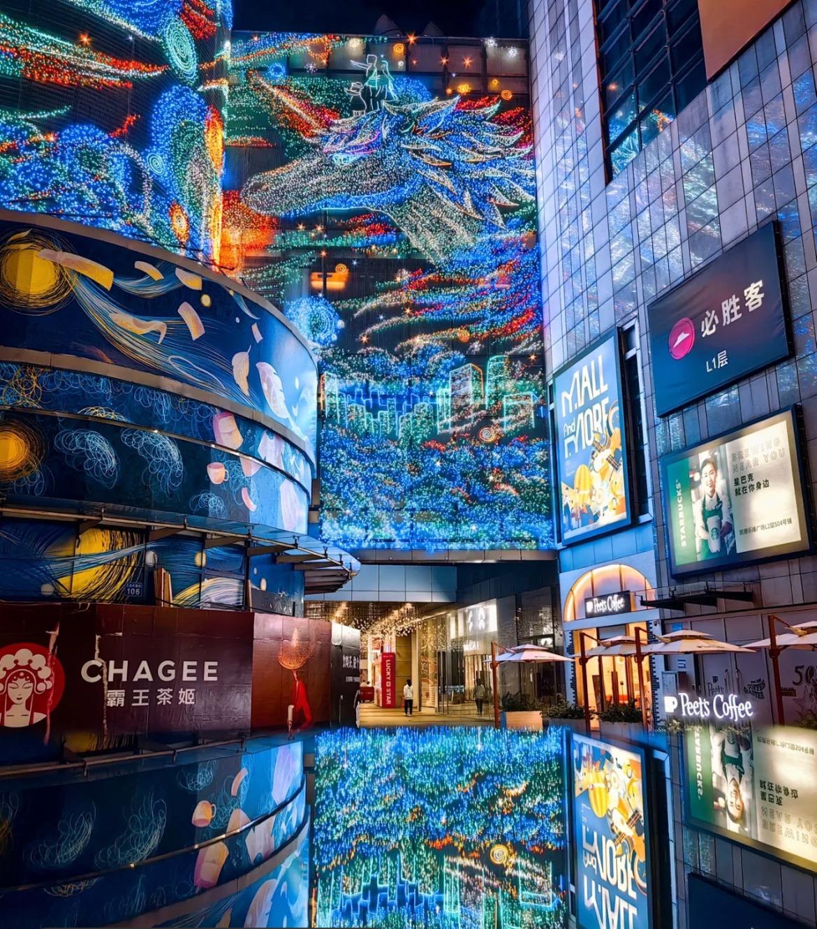 樂峰廣場的燈光牆上,巨型的獨角獸在星空中飛馳,拍攝時加入倒影效果,非常驚艷。(圖片來源:蘇詩Suzy@小紅書)