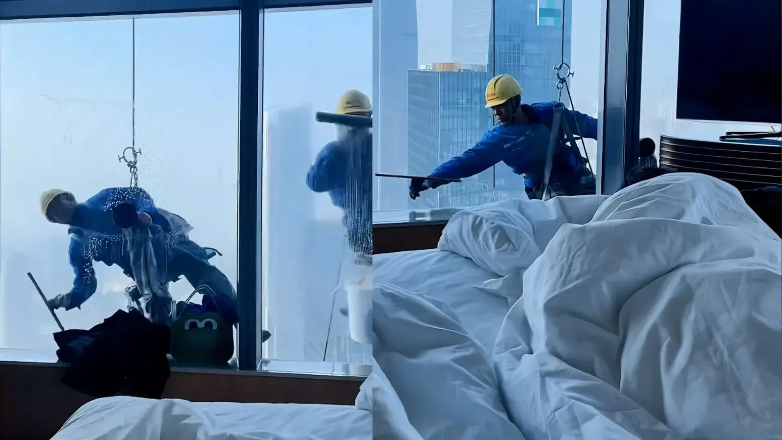 網傳影片中,大片落地窗外兩名「蜘蛛人」,身穿藍色工作服、頭帶黃色安全帽,正動作利索地清洗玻璃,似乎完全沒注意房內動靜,反倒是該名女網友一邊自拍影片,一邊語氣驚恐地直呼「這一早是甚麼情況」。