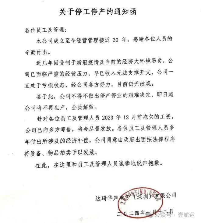 達琦華聲的倒閉聲明。(圖/取自達琦華聲電子(深圳)有限公司官方公眾號)
