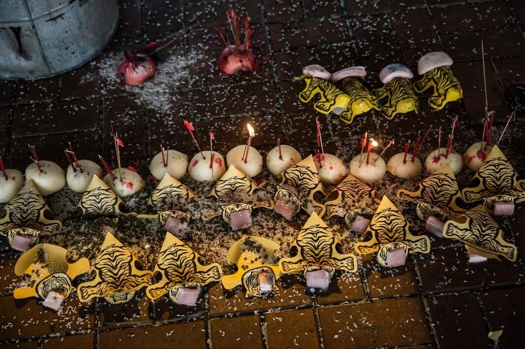 驚蟄不單流行打小人,也同時可以「祭白虎」。民間傳說指白虎是口舌、是非之神,而祭白虎是指拜祭用紙繪製的白老虎,紙老虎多為黃色黑斑紋,口角畫有一對獠牙。拜祭時,用生豬肉抹在紙老虎的嘴上,寓意其不能張口說人是非。(圖片來源:Getty)