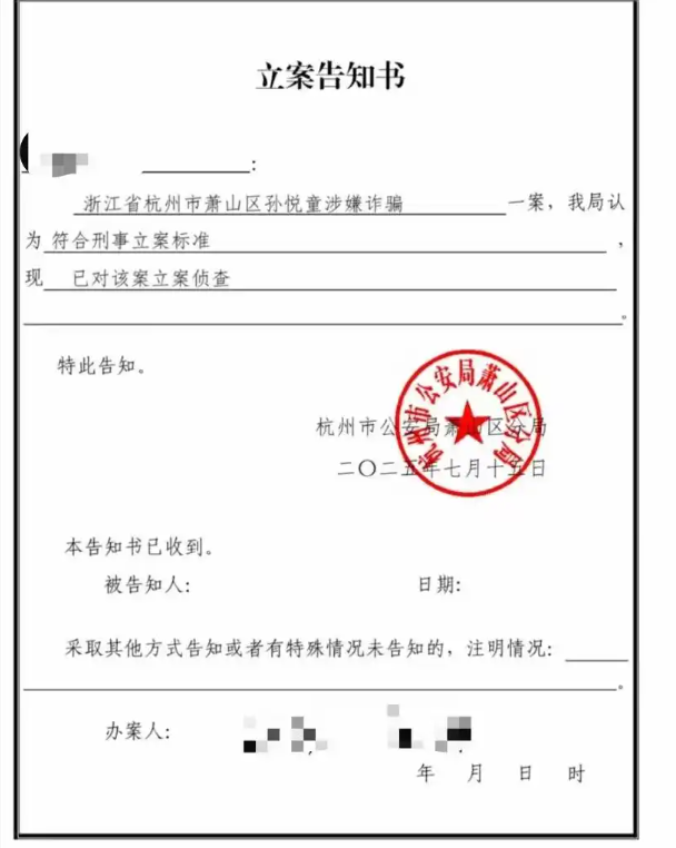 杭州警方已於7月16日出具立案告知書,確認對孫悅童涉嫌詐騙案進行立案偵查。據悉,孫悅童已被警方控制。北京偉睿律師事務所合夥人律師林虎才表示,從目前掌握的情況來看,孫悅童涉嫌普通詐騙罪、合同詐騙罪和集資詐騙罪。