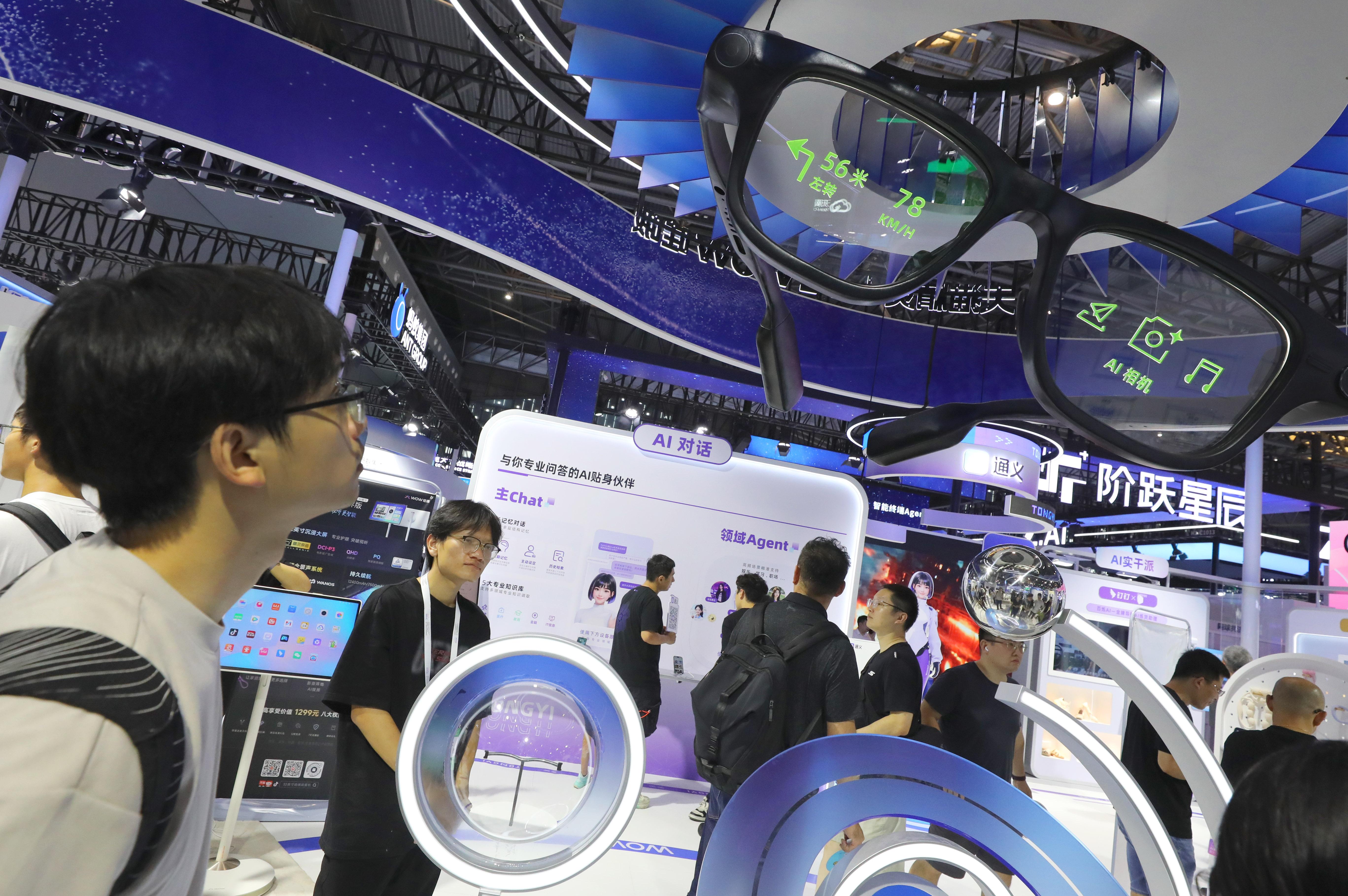 上海早前舉辦2025世界人工智能大會,一款AI眼鏡產品吸引參觀者目光。(新華社)