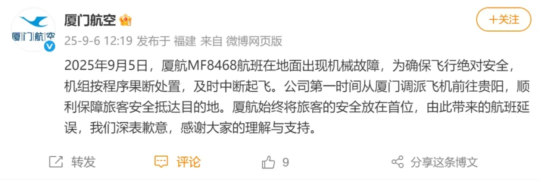 廈門航空事發後證實機械故障,深表歉意。 涉事飛機為波音737-85C,座位數170。 網上資料顯示9月6日順利起飛及降班。