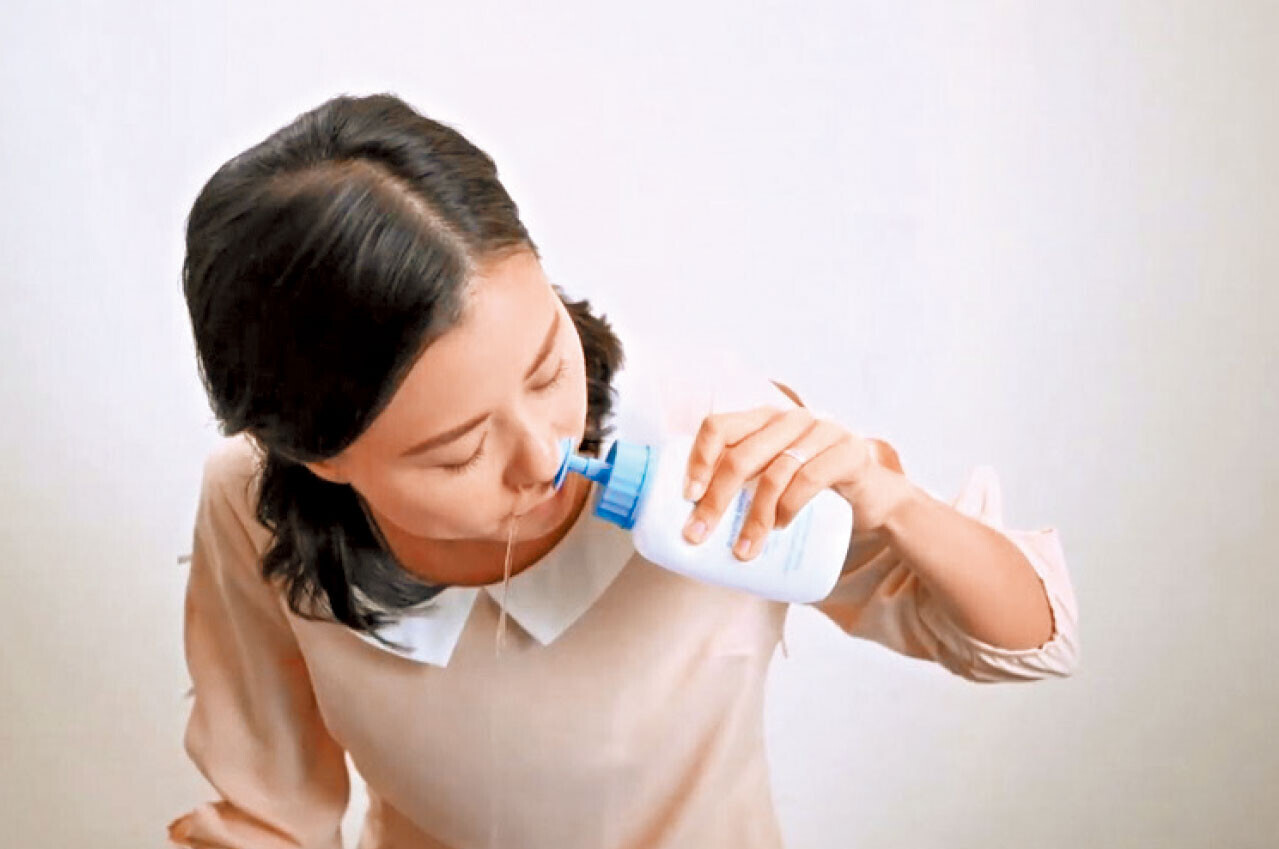 2. 將頭稍微前傾,嘴巴微微張開,將洗鼻器放入一側鼻孔,擠壓壺身,讓鹽水流入,並從另一側鼻孔流出。