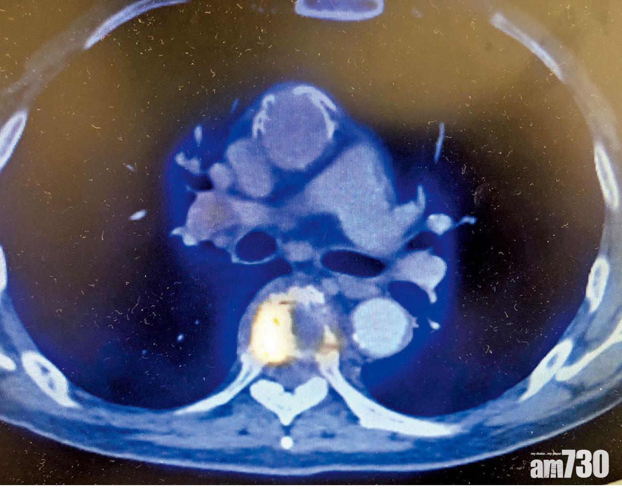 患者腫瘤壓住脊椎,導致背痛和腳痹。