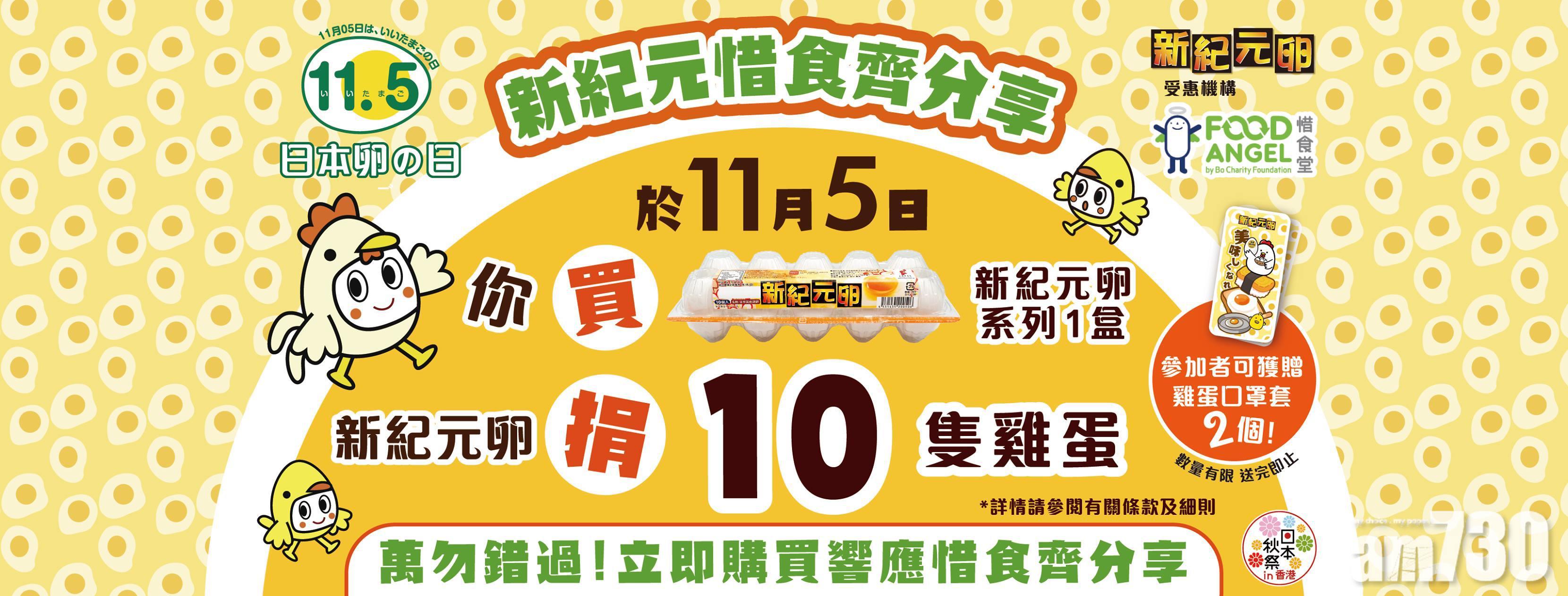 日本業界為了宣揚日本雞蛋的美味之處,將每年11月5日定為雞蛋日。為響應日本雞蛋日,「新紀元卵」今年特別與惜食堂合作,推出「新紀元惜食齊分享」活動,凡於2021年11月5日在各大超級市場購買一盒新紀元系列雞蛋,包括新紀元卵、新紀元卵赤玉及新紀卵曉,「新紀元卵」就會捐出10隻雞蛋予「惜食堂」製作飯盒,送予有需要人士,達到真「惜」食,齊分享!參加者完成網上登記更可獲贈「精美雞蛋口罩套」2個。食雞蛋不但健康有營,更可以做善事傳揚愛心,立即行動啦!
