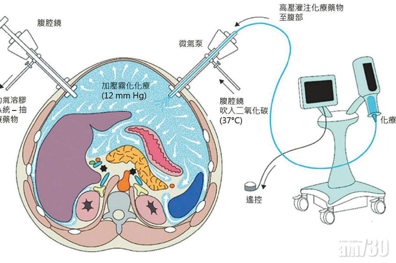腹膜腫瘤治療中心最近引入PIPAC,將化療藥用儀器加壓成霧氣注入腹腔。葉勁麟指,「PIPAC以微創形式作治療,過程只需一小時,患者可即日出院,每6周一次,輔以全身化療治療腹膜癌。」研究顯示,PIPAC可改善患者症狀,如減少疼痛(63.3%)、減少腹水(60%),以及紓緩腸阻塞症狀(45.5%)。