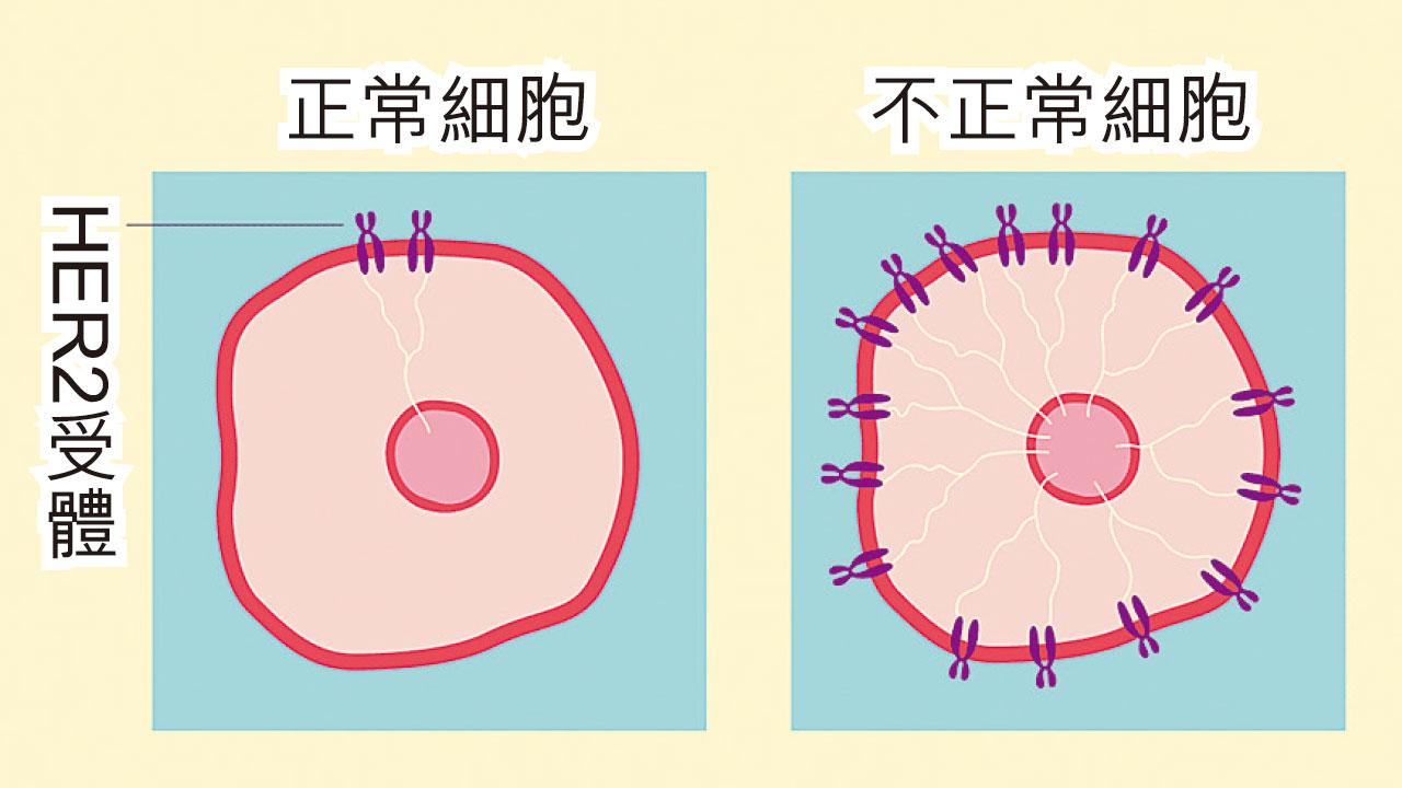 不正常細胞表面有太多HER2受體,刺激細胞過度生長,形成腫瘤。