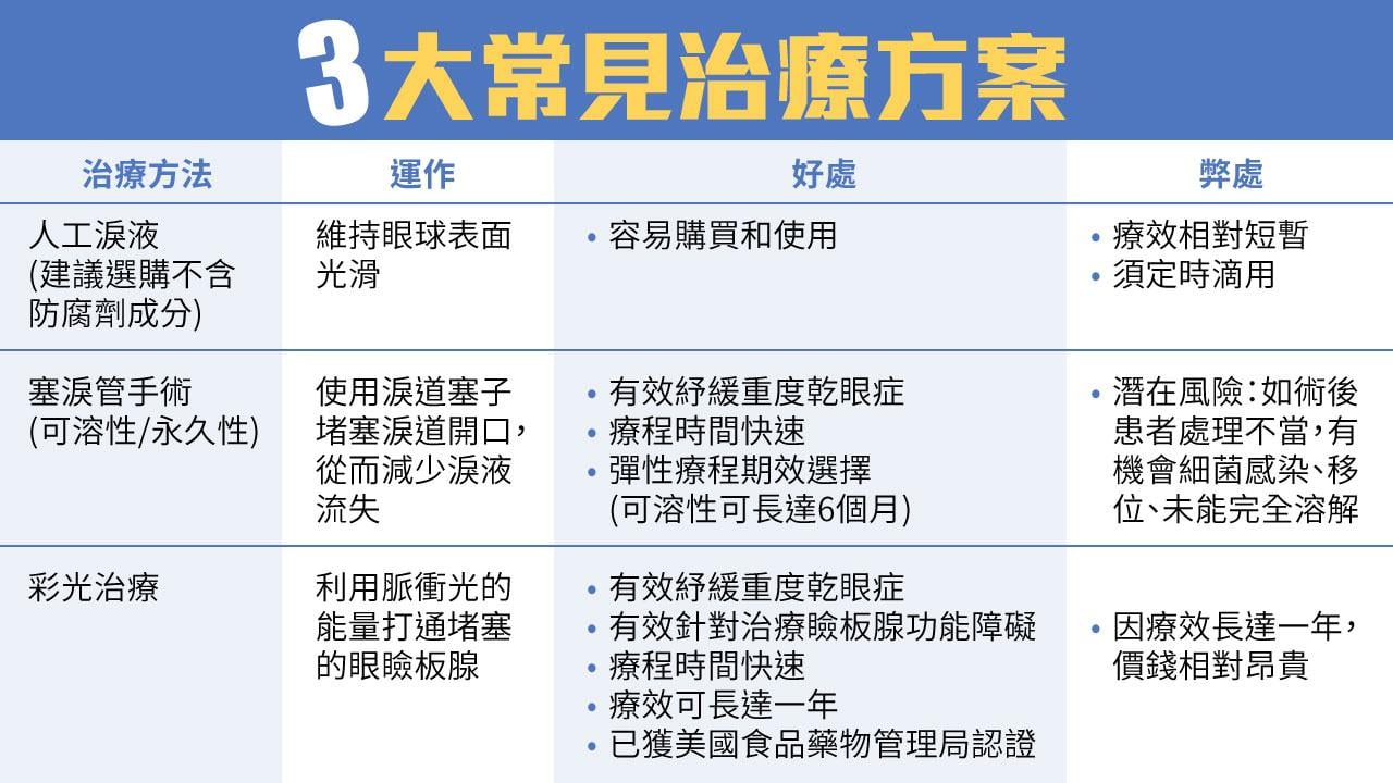 乾眼症為慢性疾病,需長期接受治療增加眼球表面的淚液、增加淚水分泌和減少淚水蒸發,以減輕症狀。