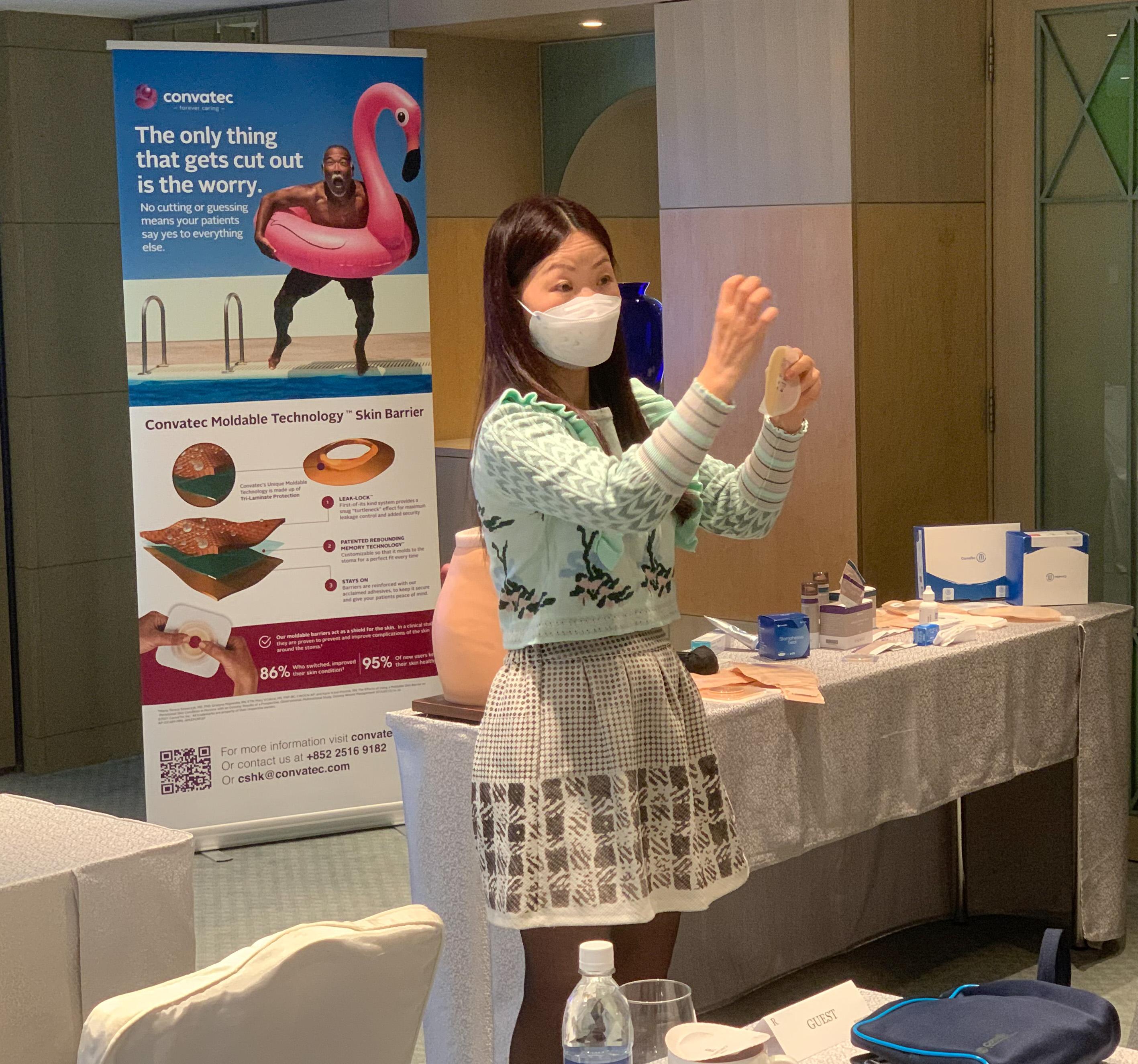 客戶服務經理兼康復寶傷口及造口護士尤姑娘在康復寶工作多年,一直為有需要的「造口人」提供協助。 尤姑娘在康復寶健康講座向造口朋友分享造口護理心得。