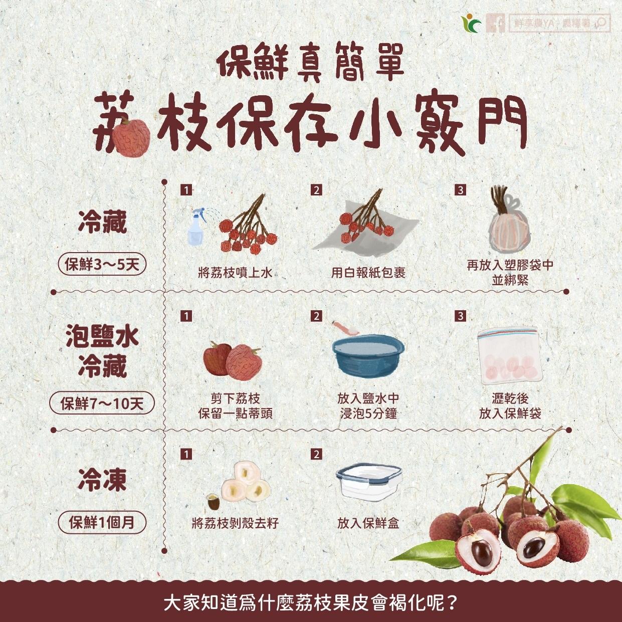 新鮮荔枝採收2至3日後,果皮便容易失水,產生硬化及褐化,所以購買後可視用途和食用頻率,以整束冷藏或個別泡鹽水冷藏保存。若想將荔枝製作為甜點或飲品,也可以去殼去籽後冷凍保存,最長可保鮮約1個月。