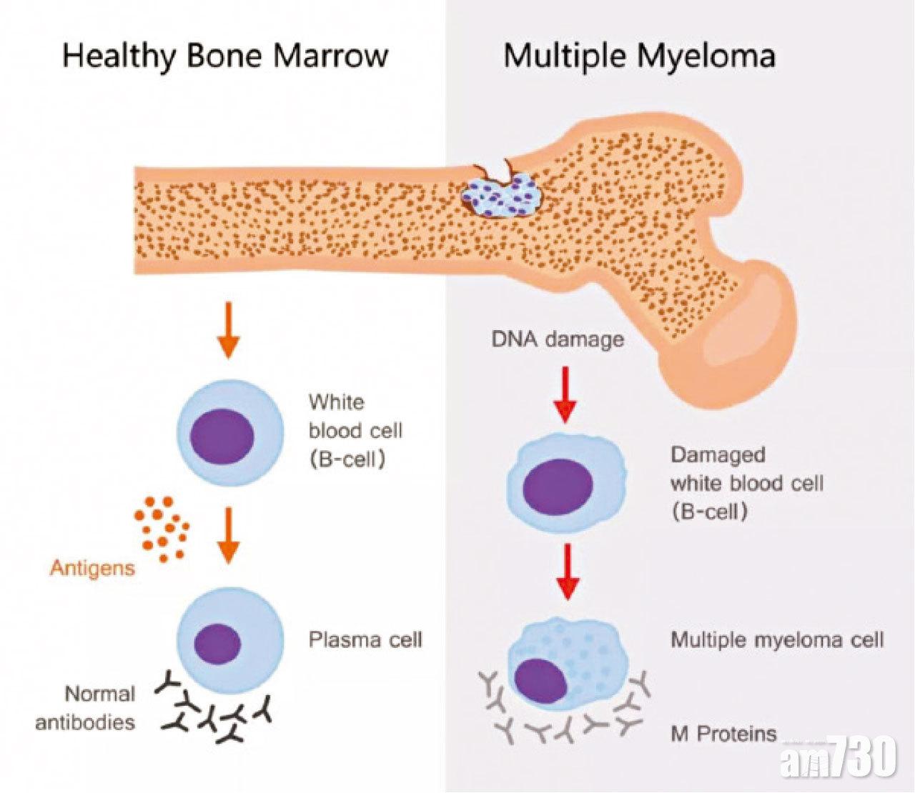 當骨髓內的漿細胞變異,會抑制造血細胞,引致貧血,而癌變漿細胞分泌出來的副蛋白,會沉積於腎臟,令腎臟受損甚至衰竭,加劇貧血的情況。陳敏航續稱當患者出現骨髓瘤相關的貧血症狀,例如頭暈氣喘,血色素往往低至8度以下,病情已屬比較嚴重。