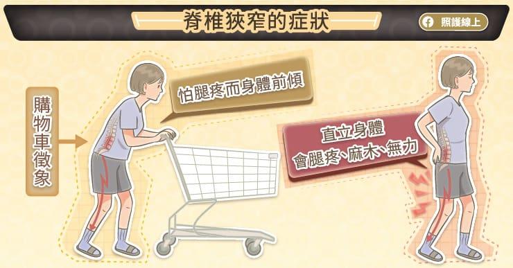 由於腰椎管狹窄症是基於退化老化而慢慢發生的,患者剛開始症狀不明顯,偶爾痛一下,抽一下,不是會引發急性嚴重疼痛的類型。整段脊椎從脖子到下背都可能有狹窄的問題,而最常見的部位在腰部下背處,患者會發現自己如果站久一點,或是走久一點,就會開始覺得腿部有抽痛感,我們稱為「神經性跛行」。由於站直直的時候症狀會更明顯,因此患者容易變成身體前傾的狀態,利用身體前傾的姿勢釋放出脊椎的空間,讓神經較不受壓迫,因而減輕了症狀。經典動作就是「購物車徵象(shopping cart sign)」,意指長者習慣推著購物車時,為了怕腿疼,身體會不自覺地微微向前傾,無法直立身體。所以,假使你觀察到家中長者會有走路前傾的模樣,要注意可以帶著長者就診,看看是否脊椎的退化老化已經造成了脊椎狹窄的問題。除了身體前傾之外,脊椎狹窄的患者會覺得坐著的時候比較不痛、不麻,因此患者會愈來愈不想活動。