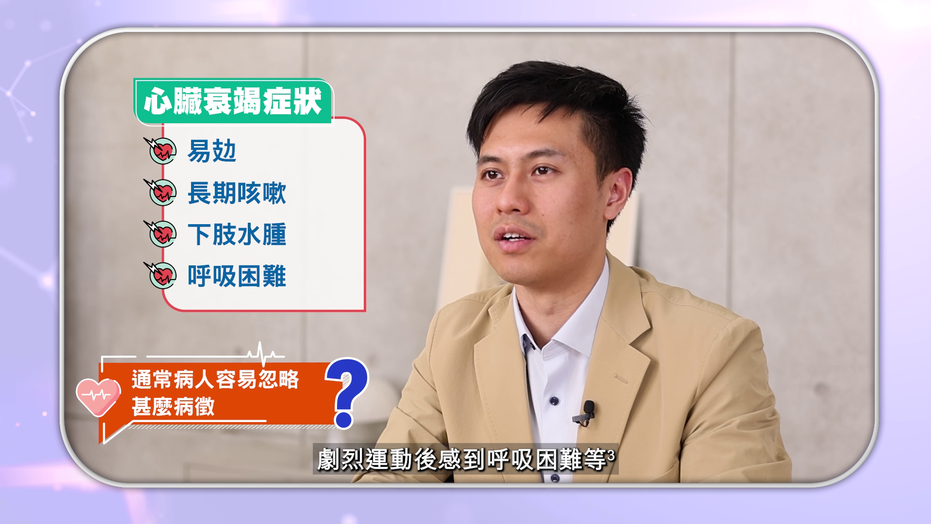 心臟日夜不停地將血液和養分輸送到全身,當心臟功能逐漸減弱,無法有效泵血時,身體各個系統都會受到影響,不僅影響心臟本身,還可能波及肝、腎、肺等器官,甚至導致死亡!研究顯示,心臟衰竭患者的五年死亡率高達60%1!「醫+實測」街訪發現不少受訪者曾經出現過氣喘、心口痛等情況,有可能是心臟衰竭先兆?心臟科專科阮嘉駿醫生提醒,及早發現問題並介入治療,是控制心臟衰竭病情的關鍵。