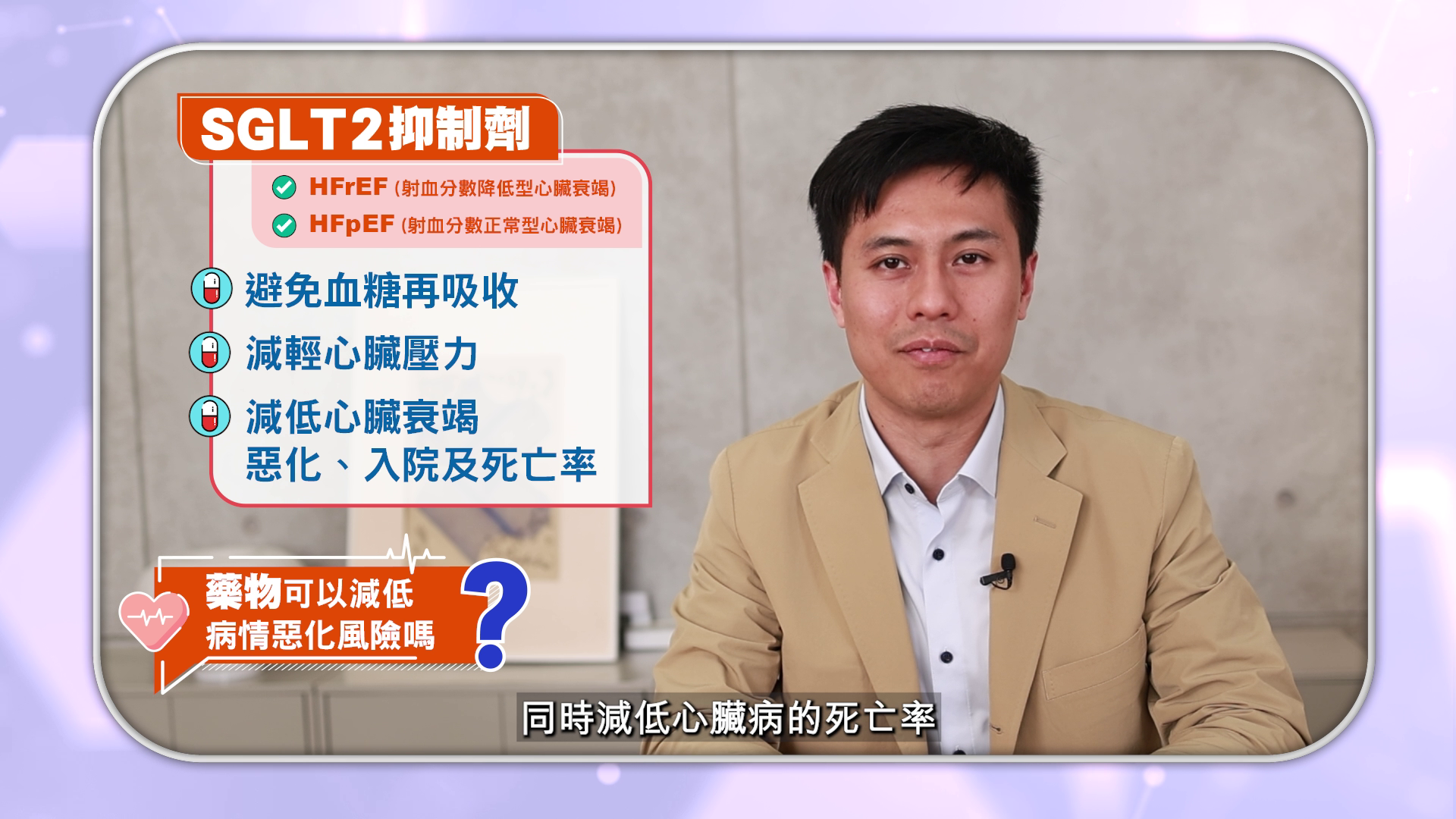 歐洲心臟學會推薦使用「四大支柱」藥物治療射血分數降低型心臟衰竭(HFrEF)4,其中,SGLT2抑制劑是唯一適用於不同射血分數的心臟衰竭的藥物,包括射血分數正常型心臟衰竭(HFpEF)5,能改善心臟及肌肉代謝、提升腎臟功能、以及有輕微利尿作用,顯著降低心臟衰竭惡化和入院的風險6。