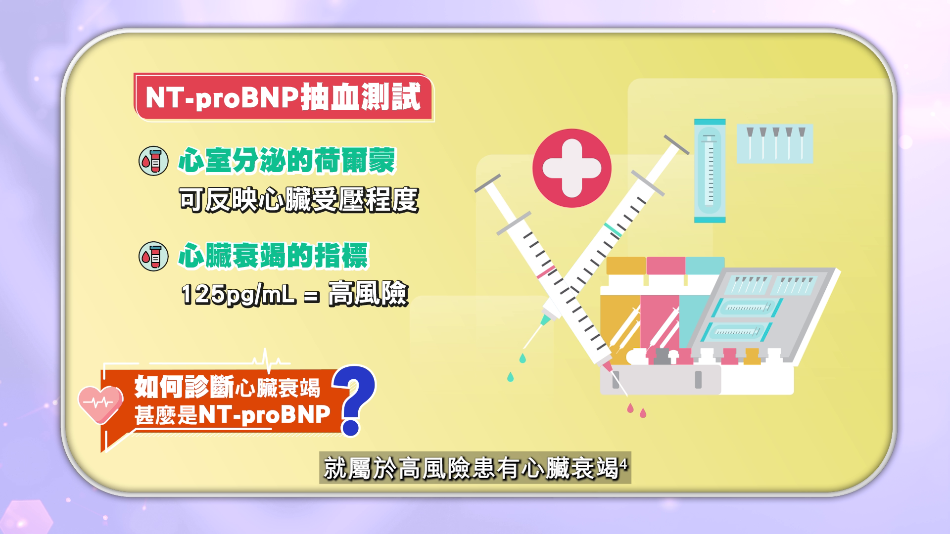 為了準確診斷心臟衰竭,醫生會使用多種檢查方法,其中NT-proBNP檢測是一項常用的指標。NT-proBNP是一種由心室分泌無生理功能的荷爾蒙分子,當心臟受到壓力或擴張時,其濃度會顯著升高,一般如果NT-proBNP數值高於125pg/mL,就屬於心臟衰竭的高風險族群3。