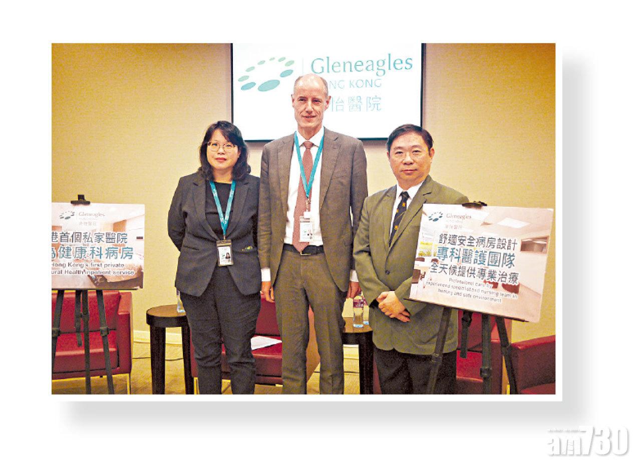 (左起)林家文、港怡醫院執行總裁Dirk Schraven及黃德興認為,行為健康科住院服務可助輕症患者及早得到適切治療。