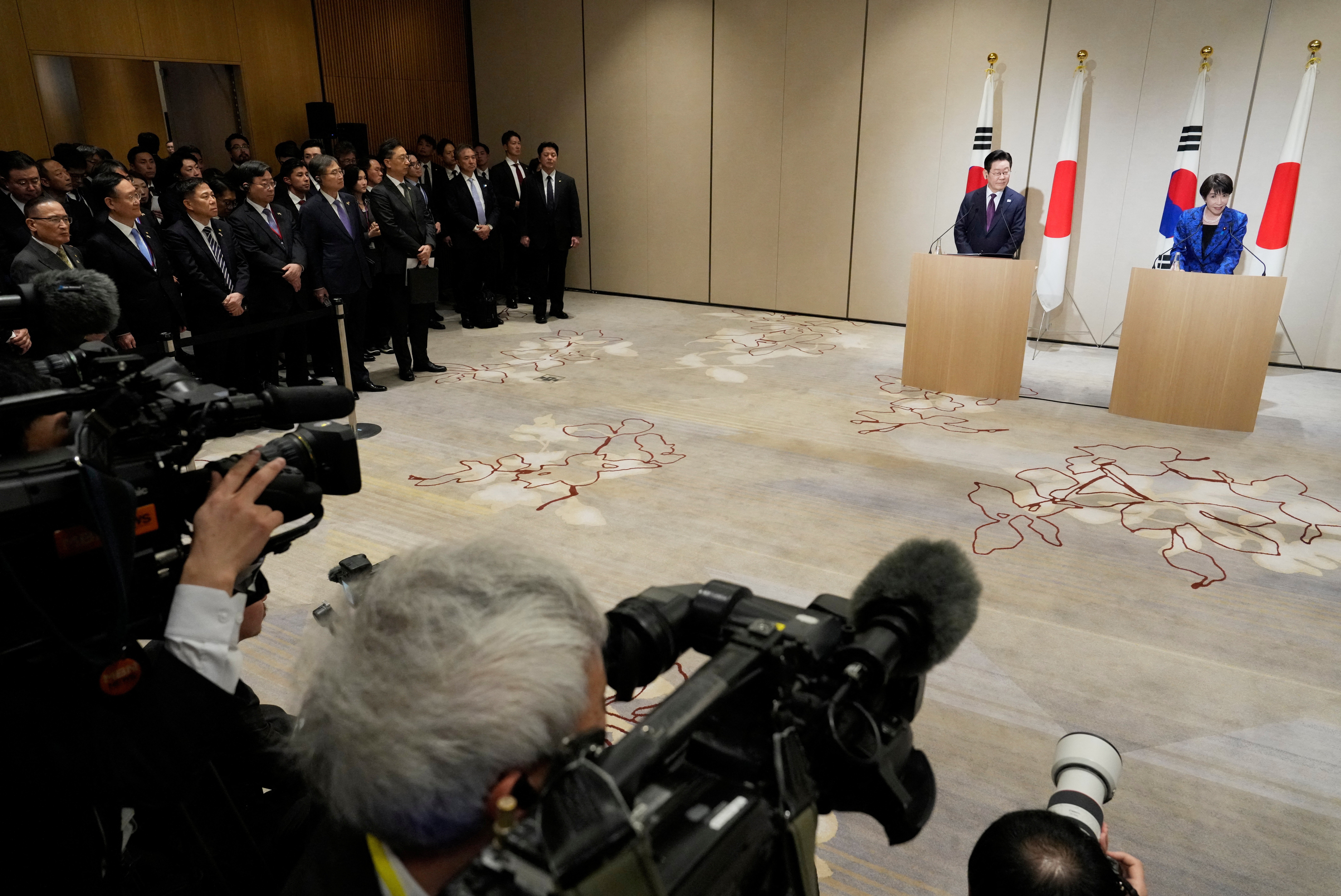 在記者會上,李在明有提及中日韓的關係,他表示:「中日韓三國需要互相溝通及合作」。除了中國之外,兩人都有談及北韓問題,兩國領導人同意密切合作,致力實現北韓完全無核化。同時李在明也表示支持立即解決北韓綁架日本人的問題,而二人也同意起草一份日韓文件,以加快打擊跨國有組織詐騙的合作。