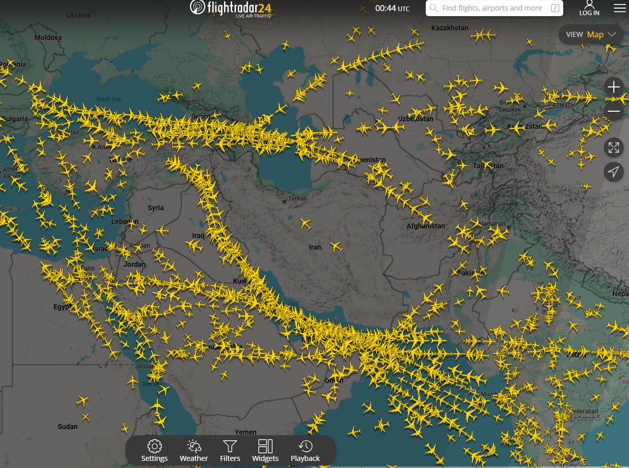 據航班追蹤網站顯示,命令發布當下伊朗上空有5架飛機,在伊朗宣布關閉領空之後,周邊飛機全數繞道而行,僅有數架獲得許可的飛機位於伊朗領空,顯示當地航空管制極為嚴苛。