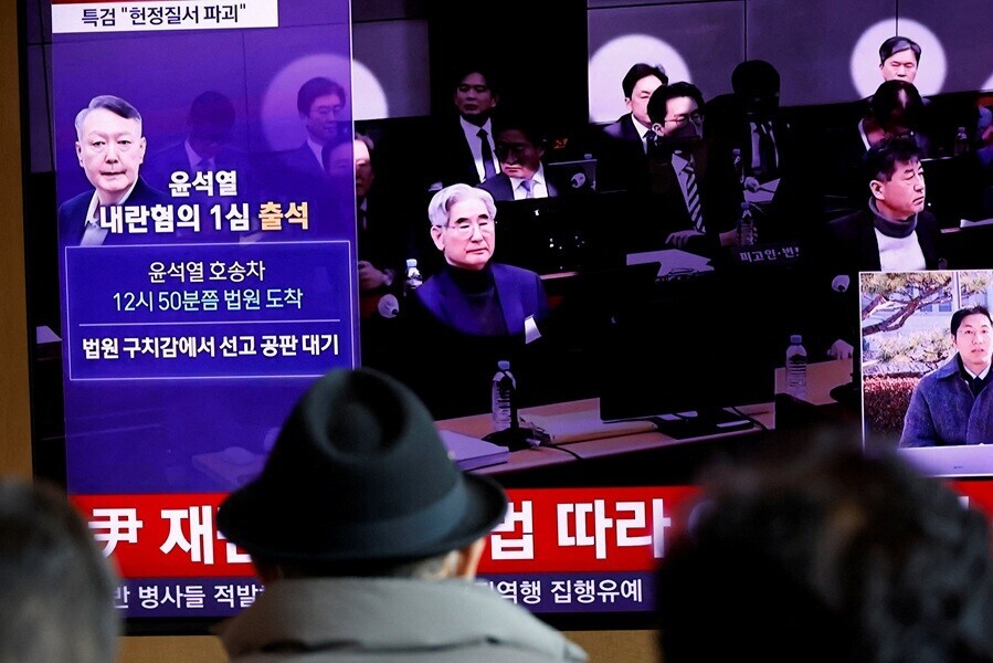 南韓前總統尹錫因內亂罪被判終身監禁。首爾民眾觀看有關報道。(路透社)