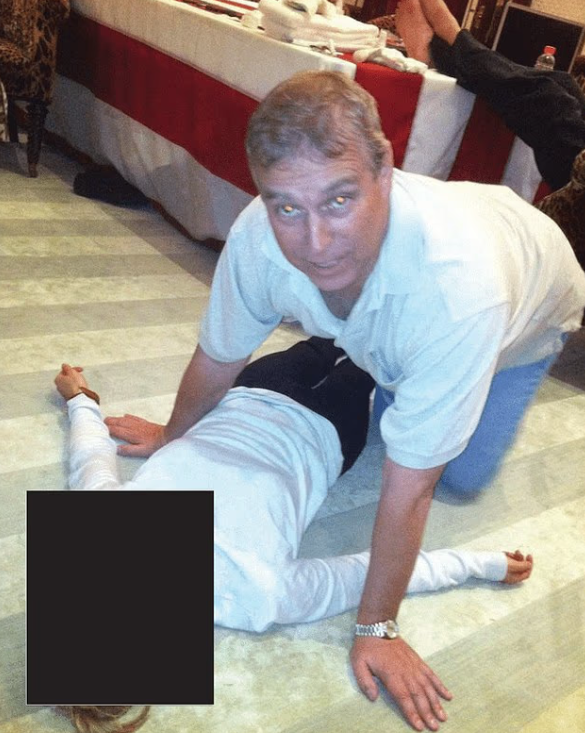 英媒整理至今曝光的部分照片及錄像,當中包含安德魯跪於一名仰躺女性上方的照片,畫面中可見該女子雙臂攤開,身後有一名男子赤足擱於桌上。