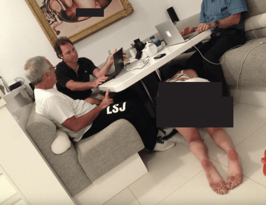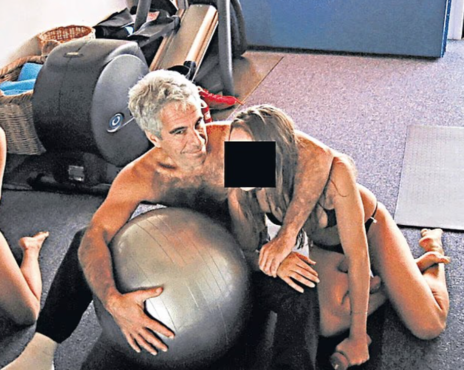 有照片揭示愛潑斯坦赤裸上身,微笑著對著鏡頭,身邊可見疑似小童的腿部,其腰間似乎圍著一條白色毛巾,坐在沙發上。照片本身雖不足以斷定任何惡行,但其與大量性交易證據一起出現,令輿論譁然。 另有照片攝於是愛潑斯坦私人島嶼大宅內的牙醫室,房內牆上掛有多個面具,未知是否有特別含意。