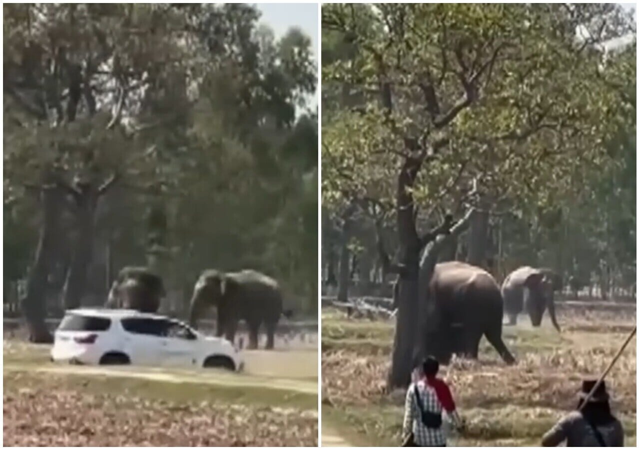 大象撞翻現場2輛汽車,更撞損多個道路指示牌,又追趕附近的村民。(YouTube) 大象撞翻現場2輛汽車,更撞損多個道路指示牌,又追趕附近的村民。(YouTube)