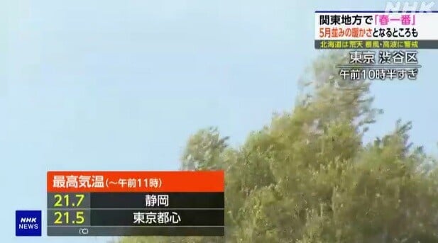此外,關東甲信地區、東海地區、九州南部等地的氣溫上升,截至上午11時,靜岡市最高氣溫錄得攝氏21.7度、東京都市區21.5度。